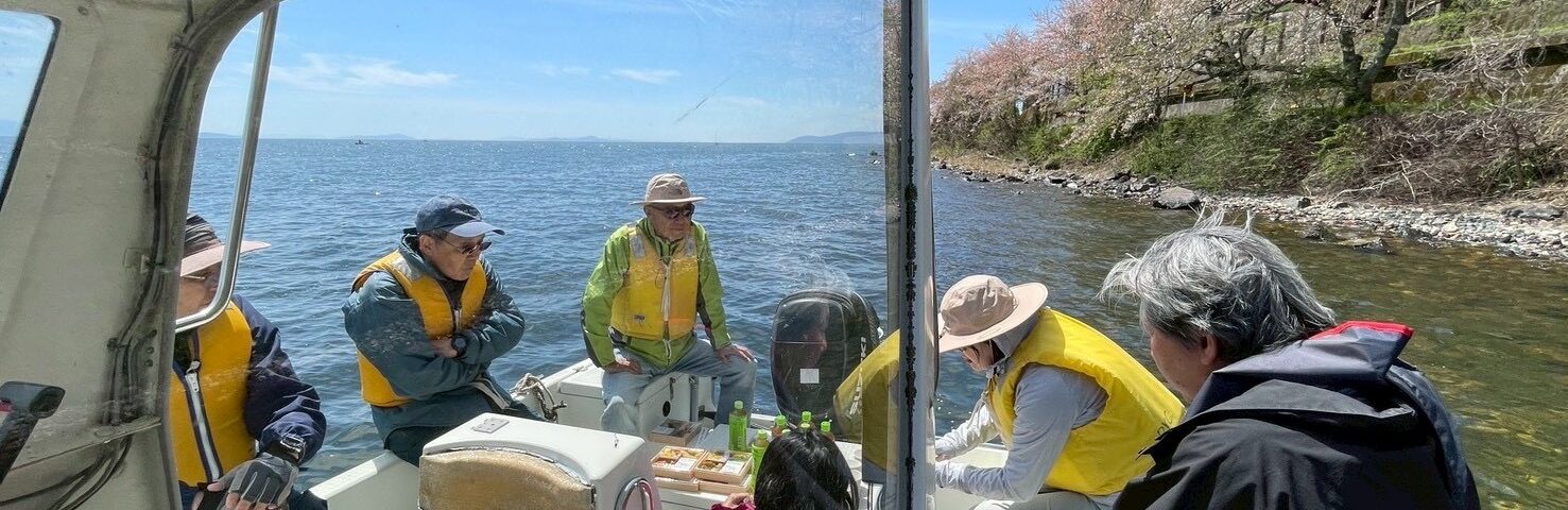 夕凪で海津大崎までクルーズ、湖上から花見を楽しみました。途中、浮御堂、沖の白石、多景島、彦根港、伊崎堂棹飛堂に寄り、内容の濃い琵琶湖秘境探訪ツアーになりました。サクラはだいぶ葉桜になっており、一週間遅いという感じでしたが、花びらが風で舞い散る風景もきれいなものでした。